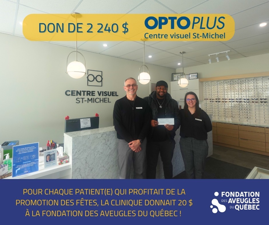 Un énorme MERCI à OPTOPLUS – Centre Visuel 3St-Michel pour leur généreux don de 2 240 $ à la Fondation des Aveugles du Québec !